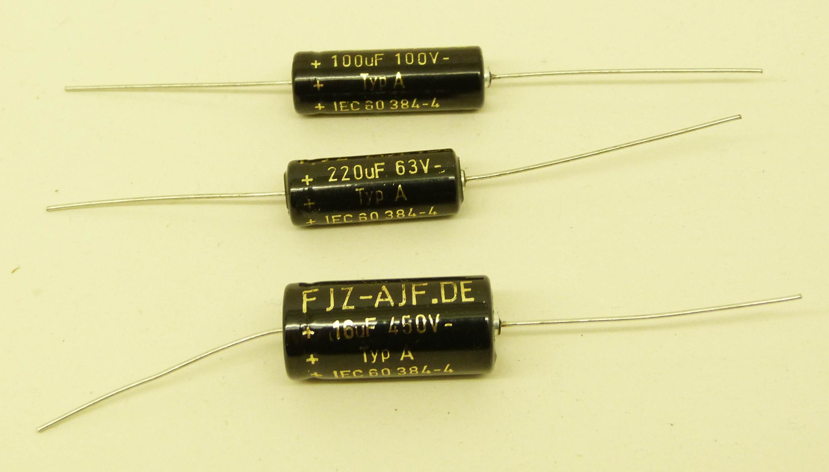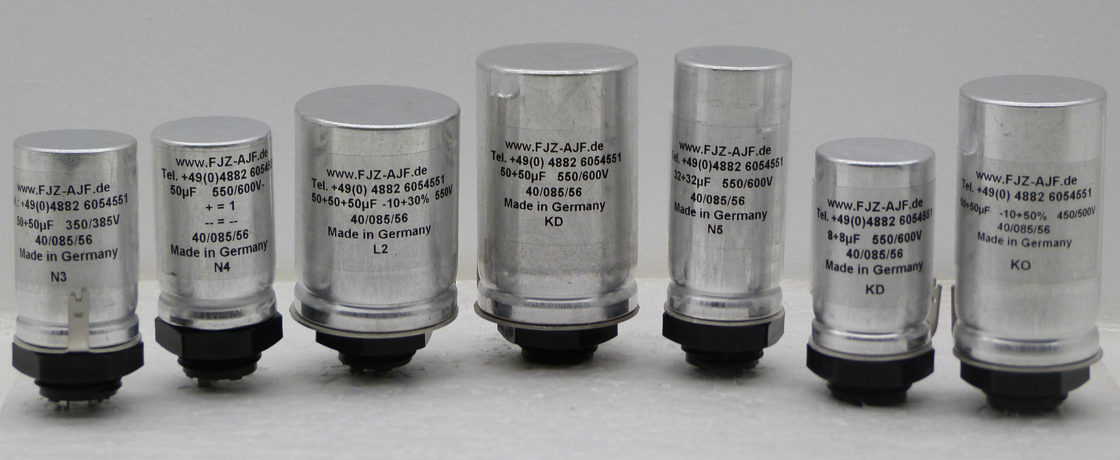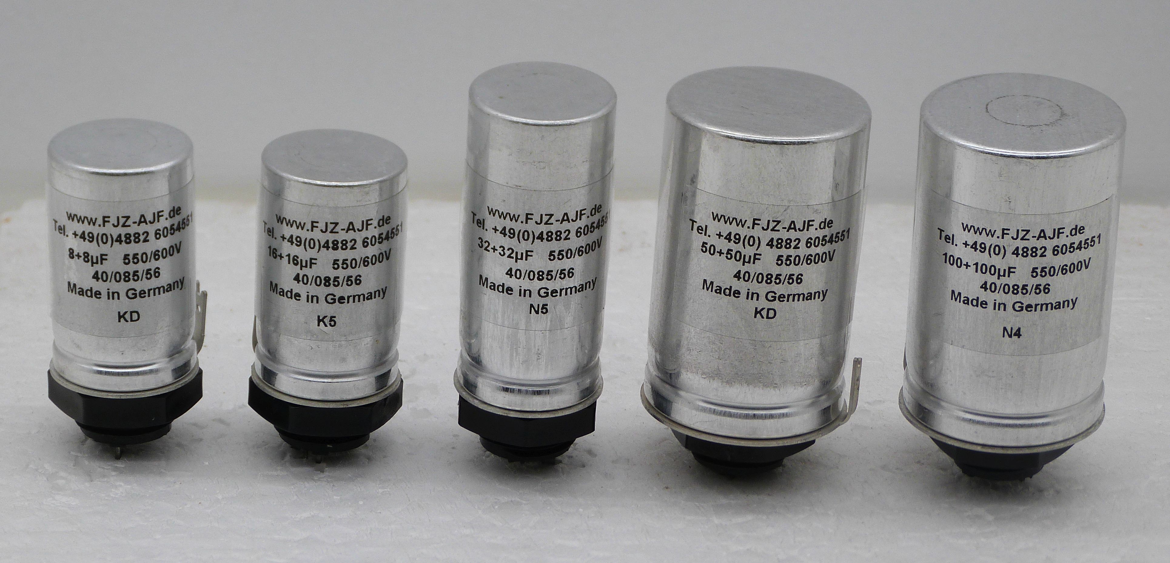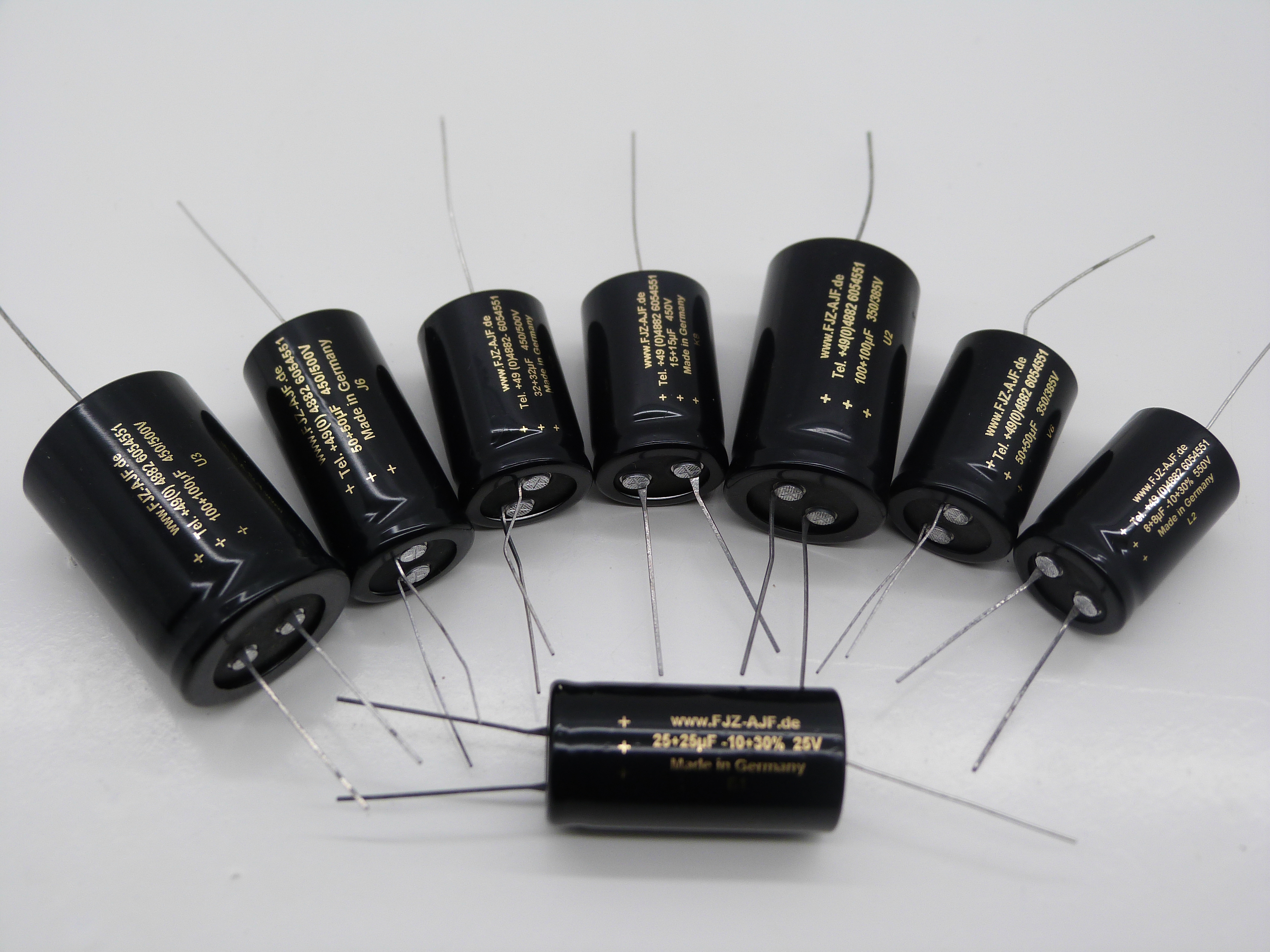 Elkos mit Lötfahnen für die Reparatur von US-Verstärkern oder den Verstärkerselbstbau | Electrolytics with solder lugs for amps repair and new construction, to be mounted with bracket | Condensateurs avec contacts radials pour construire ou reparer les amplificateurs BF etc. Montage méchanique avec un collier. | ||||||