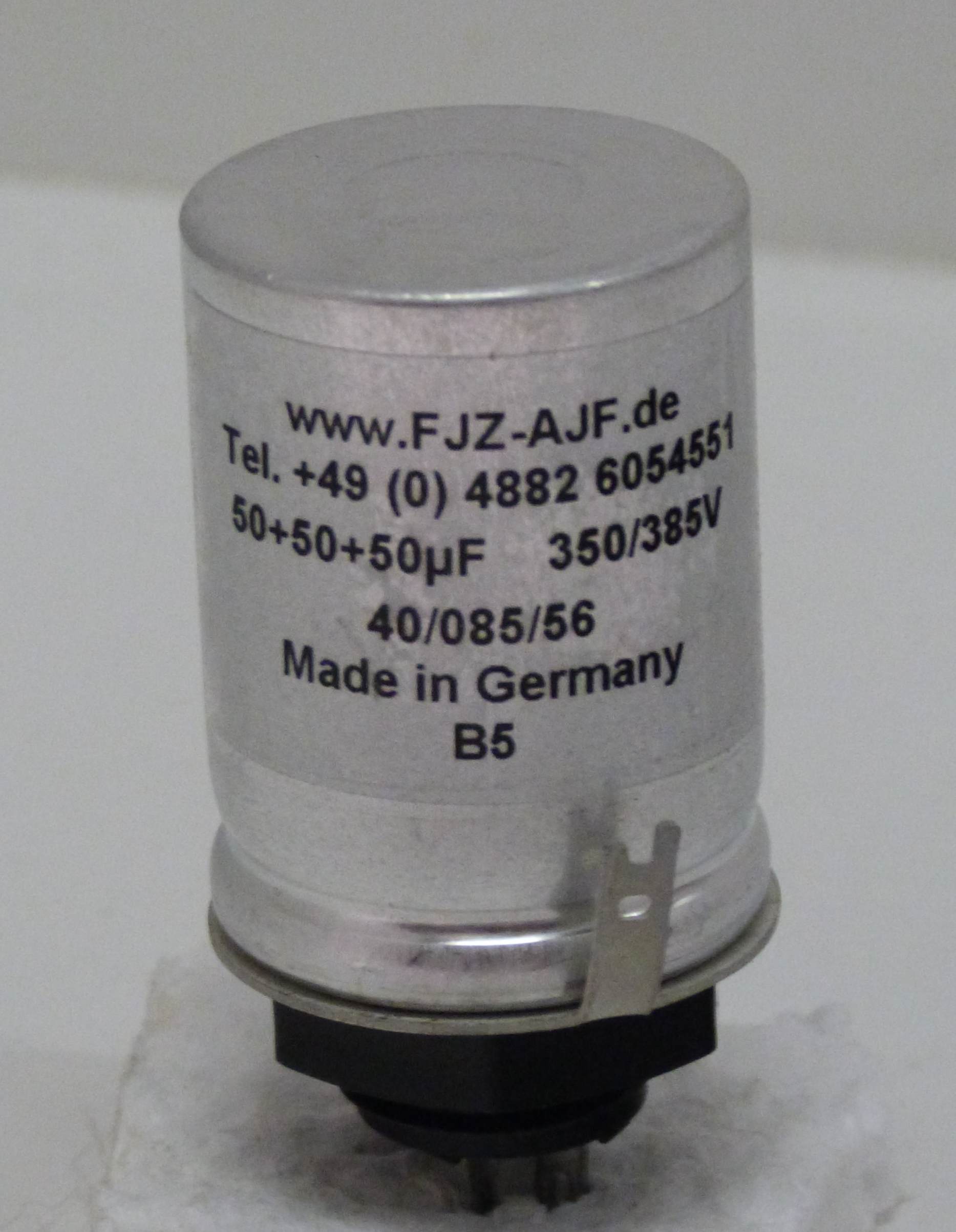 350V für SABA etc. sehr kompakter, kurzer Becher, 30*40 Ersetzt auch den nicht lieferbaren 50+100uF, einfach zwei der drei 50uF-Sektionen zusammenklemmen. |
