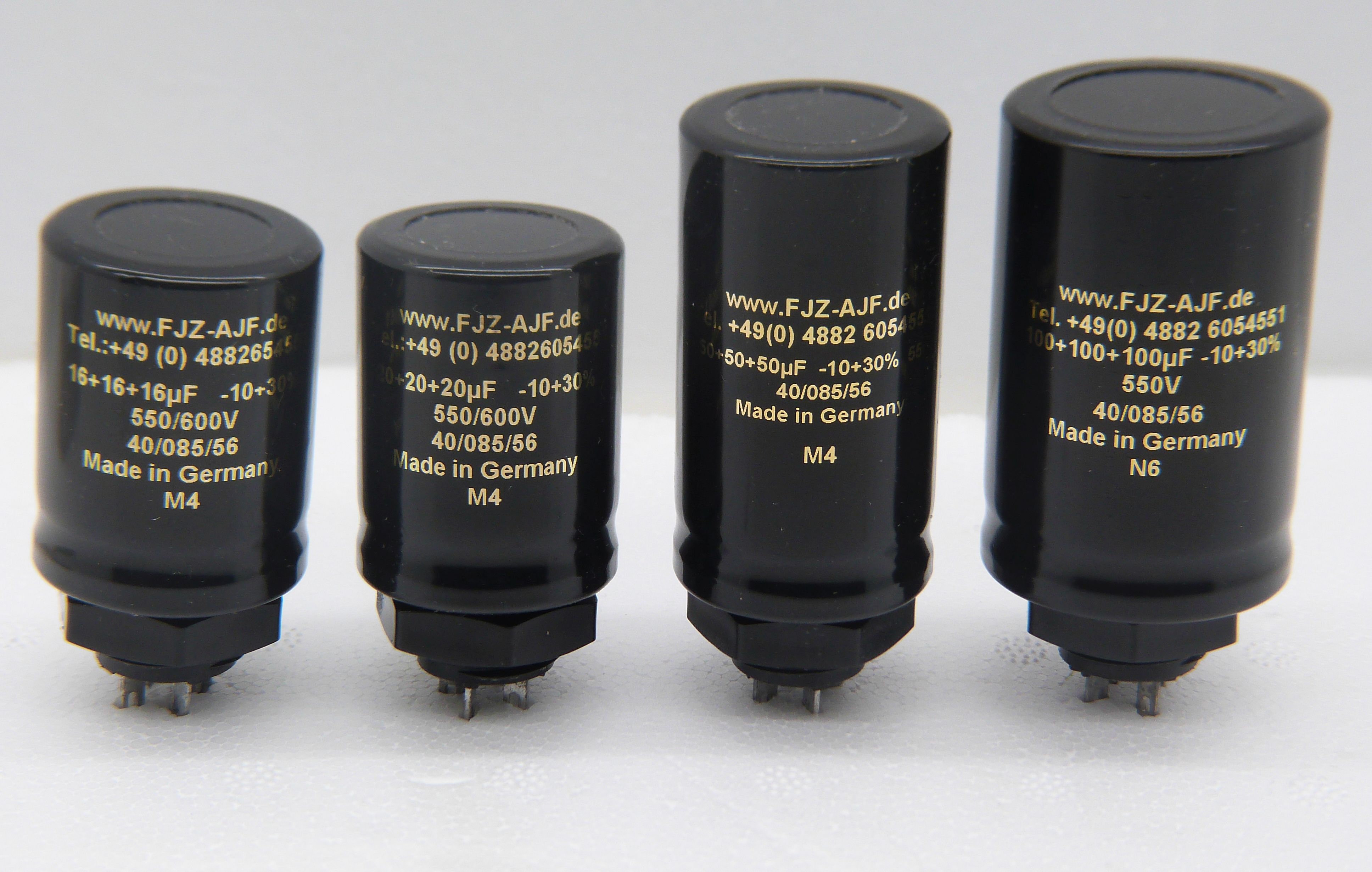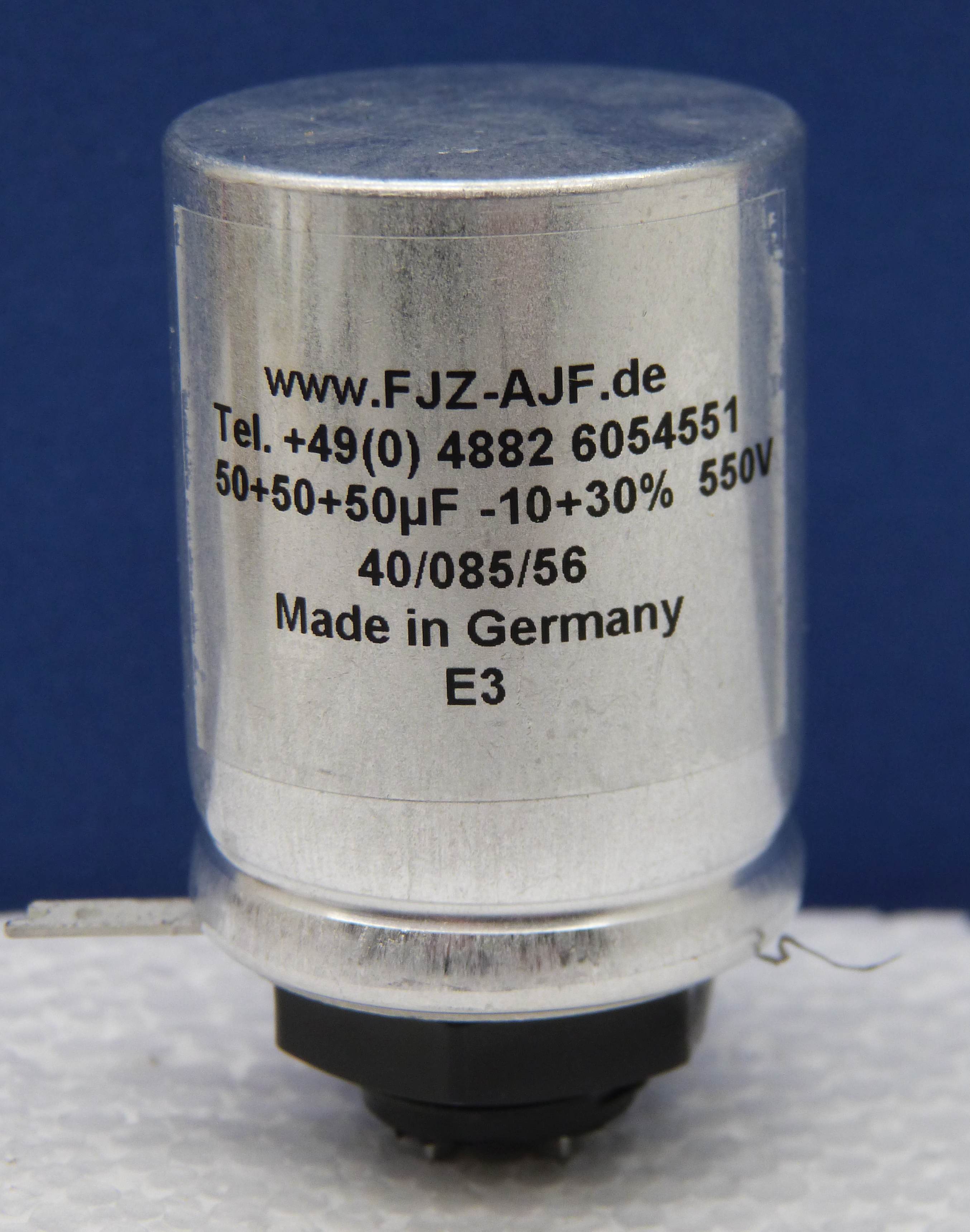 Radial electrolytic, current manufacture Triple-50 µF 550V (!) very very compact design, 30mm diameter, use in TVsets, as retrofit to fill cans, on PCBs and also for free wiring, pins allow both options. Use where space is REALLY CONFINED | Triple chimique, 3 * 50 µF 550 V Fabriqué en Allemagne, 30 mm de diamètre, très très très compacte pour utilisation dans les TV, comme retrofit, dans les amplis compacts, tuners etc. Excellent ou l´espace est vraiment très limité. | 22,17 | 26,38 | FTCap